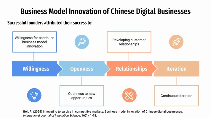 The research explores how young Chinese digital businesses develop and innovate their business models to survive in fast moving and competitive markets. This addresses the lacuna highlighted in the literature regarding the lack of understanding of how business model innovation contributes to business success, and how new digital ventures develop competitive advantage. The findings add support for the contention that business model innovation can play an important role and is beneficial in the success of new digital ventures in highly competitive environments. The founders attributed their success to a willingness for continued business model innovation, an openness to new opportunities, developing customer relationships, and continuous iteration.